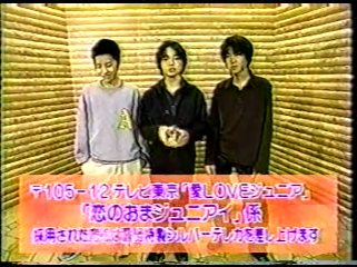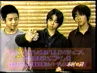 “Ai LOVE Junior” is a variety show produced by TV Tokyo that aired on TV Tokyo affiliates from April 8, 1996 to September 28, 1998. It ran for a total of 128 episodes and was hosted by Utsumi Mitsuyoshi. Regulars on the show included Arashi (as Johnny’s Jrs), Takki, Yamapi and Ikuta Toma (plus other Jrs).