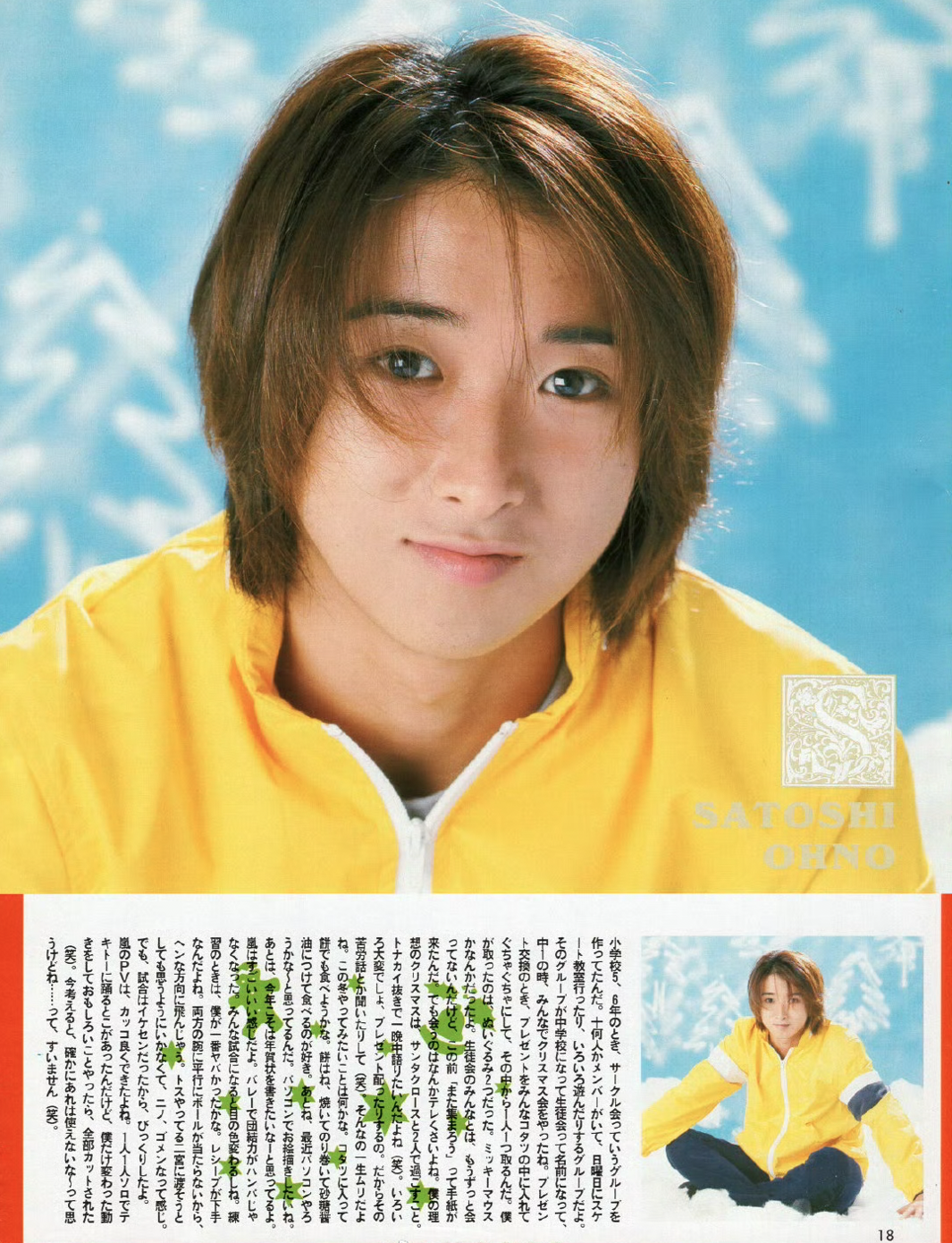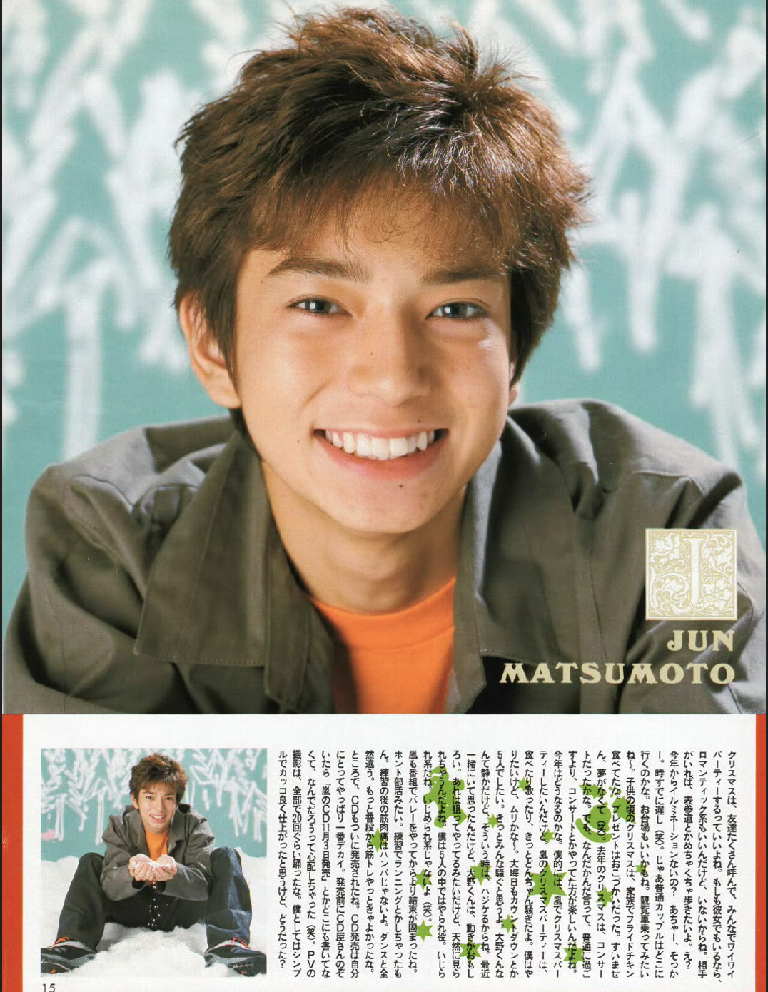★ Christmas is a once-a-year event. And Christmas 1999 was a once-in-a-lifetime experience. So it would be great to have a Christmas like the ones in the TV dramas. I’d like to walk down the street where classy older people are walking about and as a couple, go to a restaurant with an open terrace, And then it starts snowing… I’d love to experience something like that someday. It would also be nice to have a party with all my friends in a log cabin or something. But the reality is so lonely (lol). ★ Last year, I got injured at a concert and spent Christmas in the hospital. Everyone at the concert hall was probably saying “Merry Christmas!” It’s so frustrating. Christmas only comes once a year, so we should enjoy it. ★ Speaking of winter, I often ski. I still haven’t been snowboarding. Why does everyone want to do it? You shouldn’t do a sport just because it looks cool! Can you jump on a snowboard? Can you soar for 100 meters or more? Skiing is definitely the original. Being the original is powerful. I guess it’s a double-edged sword (lol). ★ By the way, Arashi released a CD and finished the promotional video. Arashi is basically a group of five very danceable people, so I think the dance is really cool in the PV. I’m just barely keeping up (lol). But I’m the drama team leader, so I really can’t help it!! ★ Speaking of dramas, “V no Arashi” is all over now, and looking back, it was really tough. But it was fun. I want to do more dramas. I like both comedy and serious dramas. I’m also good at war stories and period dramas (lol). I think I could do any period drama, whether it was the Meiji, Taisho, or Showa eras. Going back to the Edo period would be a bit tough (lol), but I definitely want to do a drama. Also, is everyone watching the World Cup? Please look forward to our activities, including volleyball, until the very end! ★